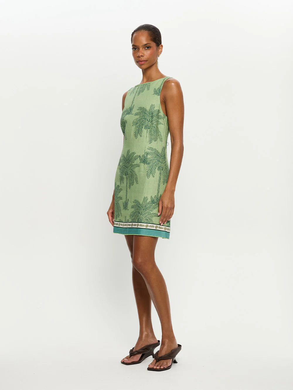 Alani is a leafy botanical print featuring deep green palm trees scattered across a soft sage green base. The Alani Mini Dress is a relaxed silhouette featuring a boat neckline trimmed with lace, a keyhole detail at the back, and a contrast border along the hem. A timeless style designed for warm, effortless days.