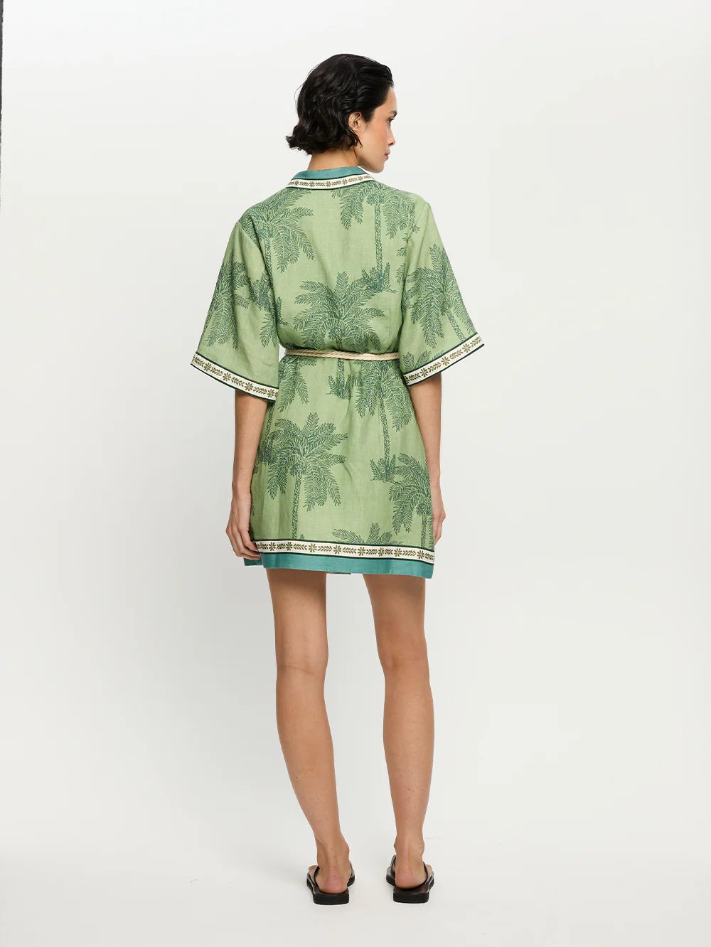 Alani is a leafy botanical print featuring deep green palm trees scattered across a soft sage green base. The Alani Mini Shirt Dress is a relaxed fit featuring kimono style sleeves, signature buttons, contrast border print details. Featuring a button-through front and a removable waist tie, it offers a balance of ease and shape. Designed for warm days that drift into balmy evenings.