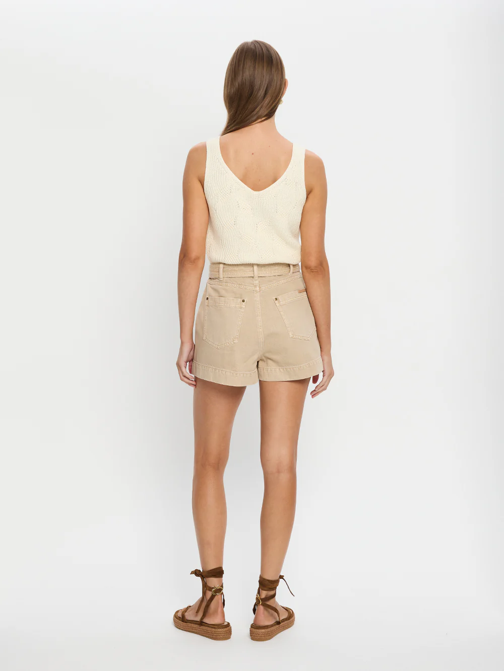 A modern essential, our signature Aloe Knit Cami in a cream hue features a v-neckline, wave stitch detailing throughout complete with a ribbed hem.