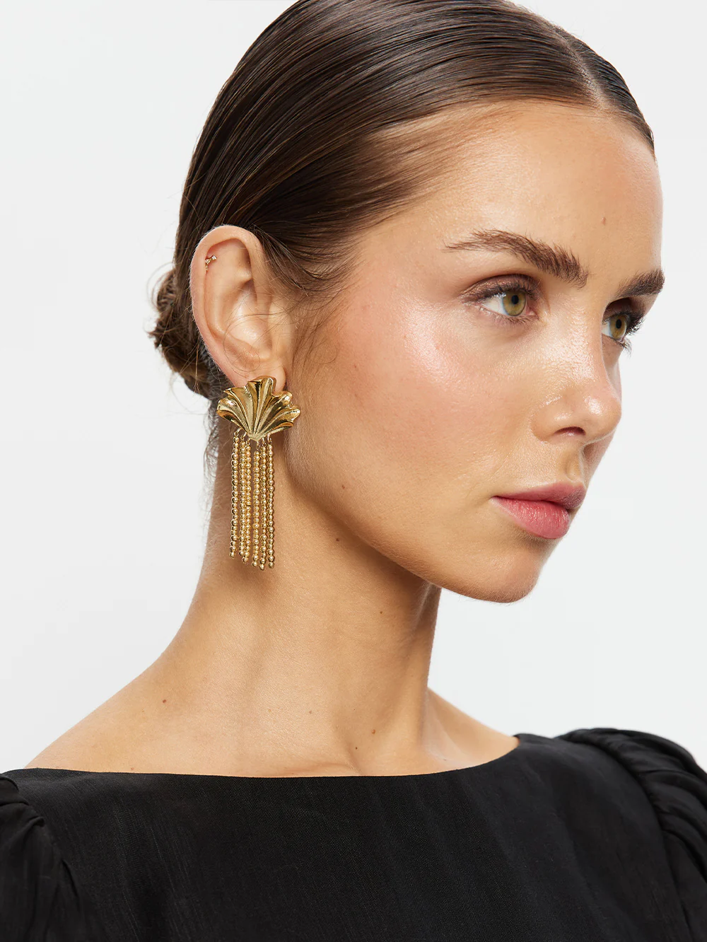Inspired by the intricate form of seaside shells, the Aurelia Earrings feature a sculptural shell stud adorned with cascading gold beaded detailing.