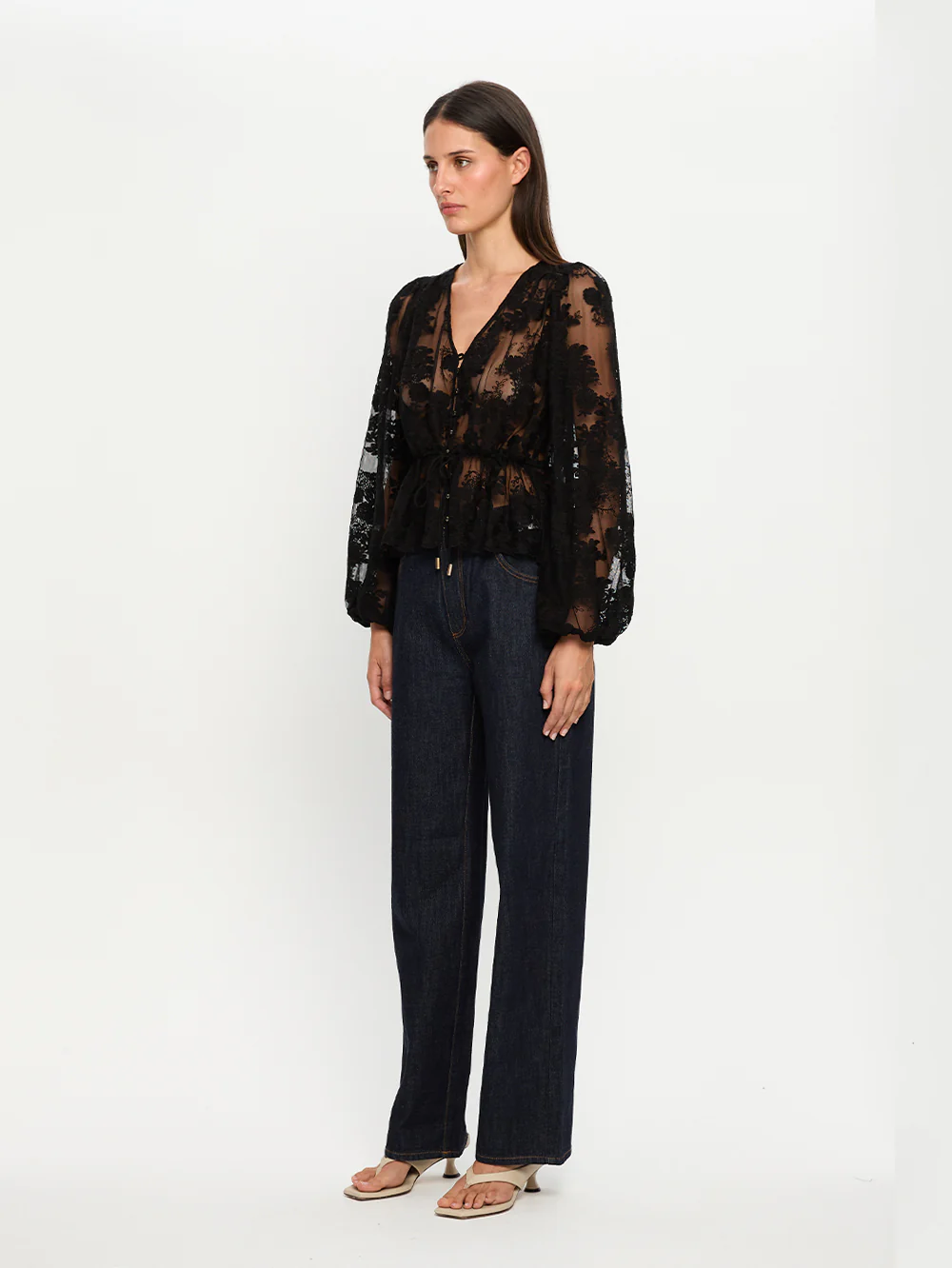 The Blaire Lace Top in black is a v-neck sheer lace peplum blouse featuring blouson sleeves and is complete with a drawcord at the waist.