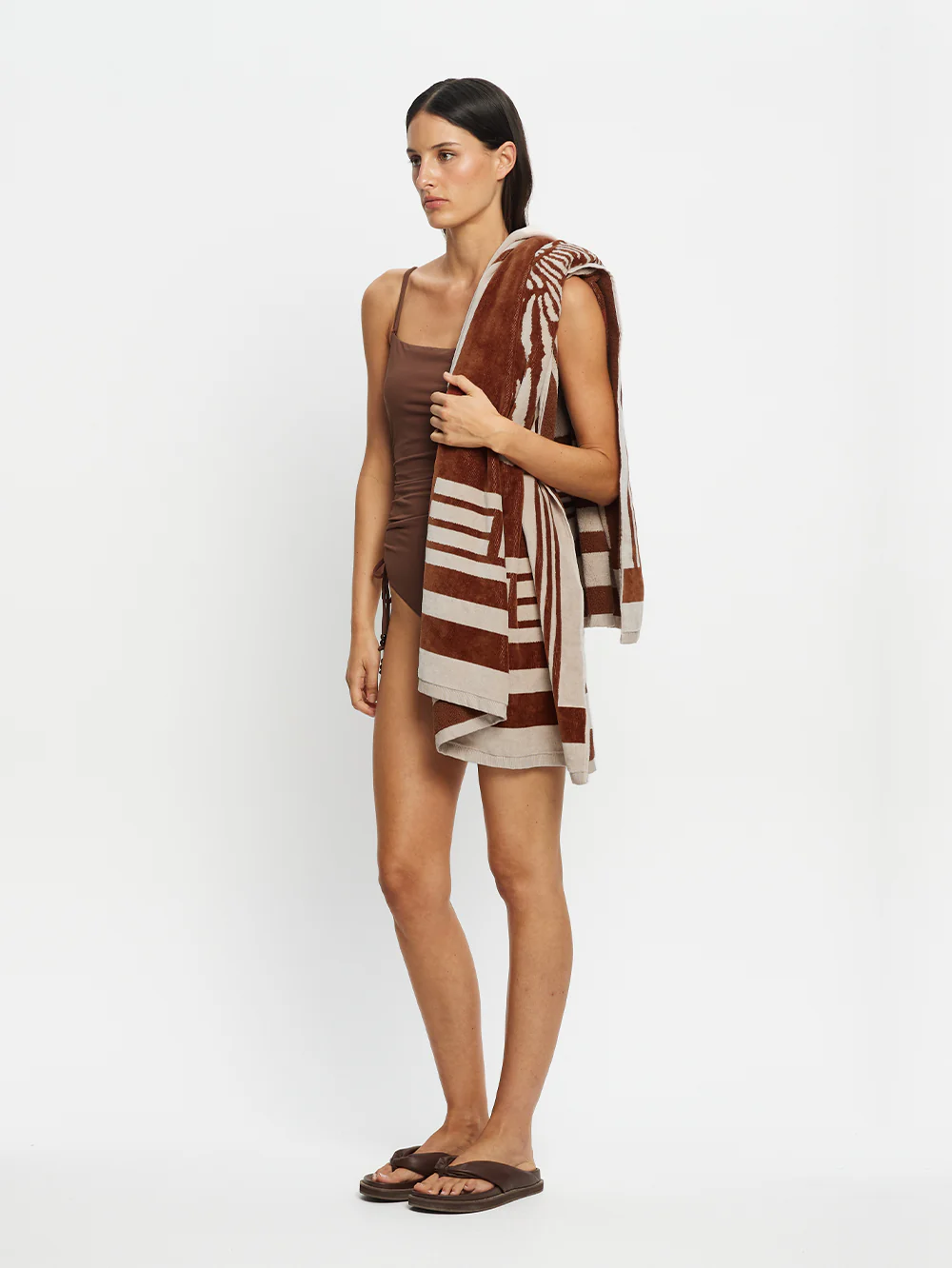Crafted from a yarn-dyed jacquard, offering a luxurious hand feel, the Coastline Towel features an intricate shell motif framed by a contrast mocha and blush border. Inspired by coastal treasures and sun-soaked escapes, its rich texture and tonal depth balance softness and structure — a timeless design made for slow days by the sea or quiet moments at home.