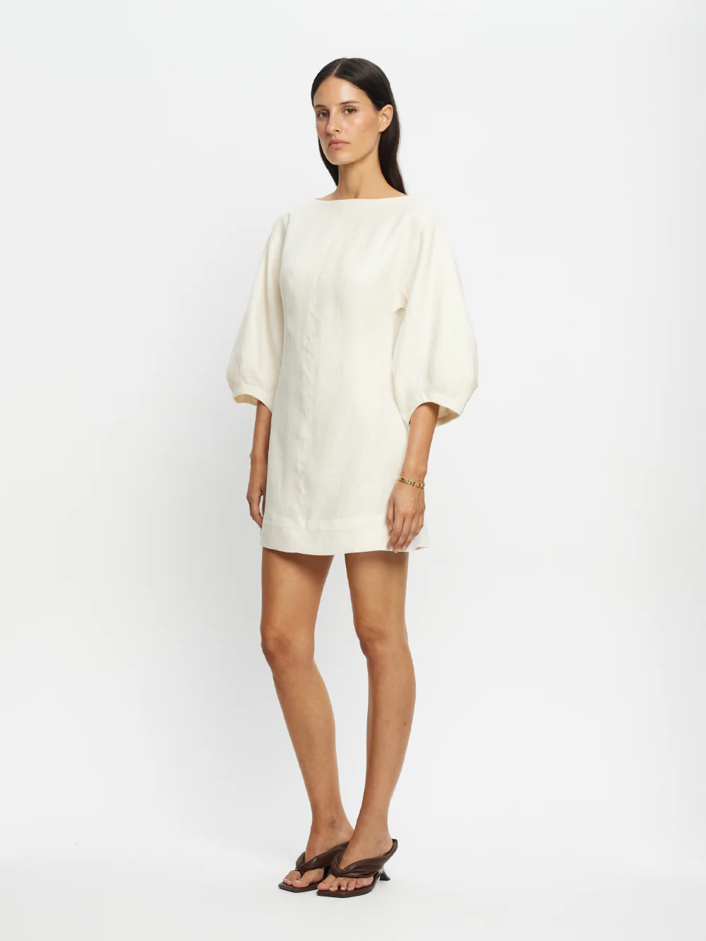 The Indra Mini Dress in ivory features a boat neckline and long sleeves, finished with soft dart detailing at the bust and an invisible back zip for a clean, refined look. Effortless from day to night — ideal for sunlit gatherings and evening celebrations.