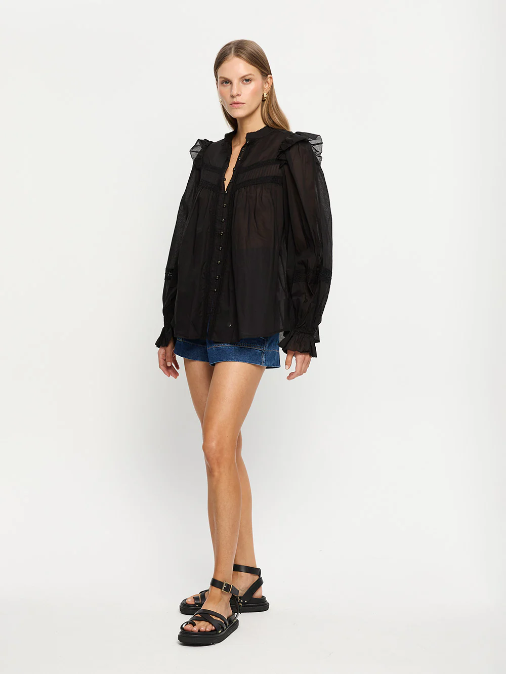 Crafted from 100% Cotton, the Isabella Blouse in black, features a button-through front with a picot-edged collar, full-length blouson sleeves with shoulder frill and lace panel detailing.