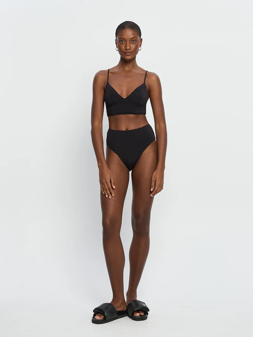 The Luca Paneled Bikini Bottom in black is a high waisted silhouette featuring moderate coverage and panel seam details. Pair with the Luca Paneled Bikini Top to complete the look.
