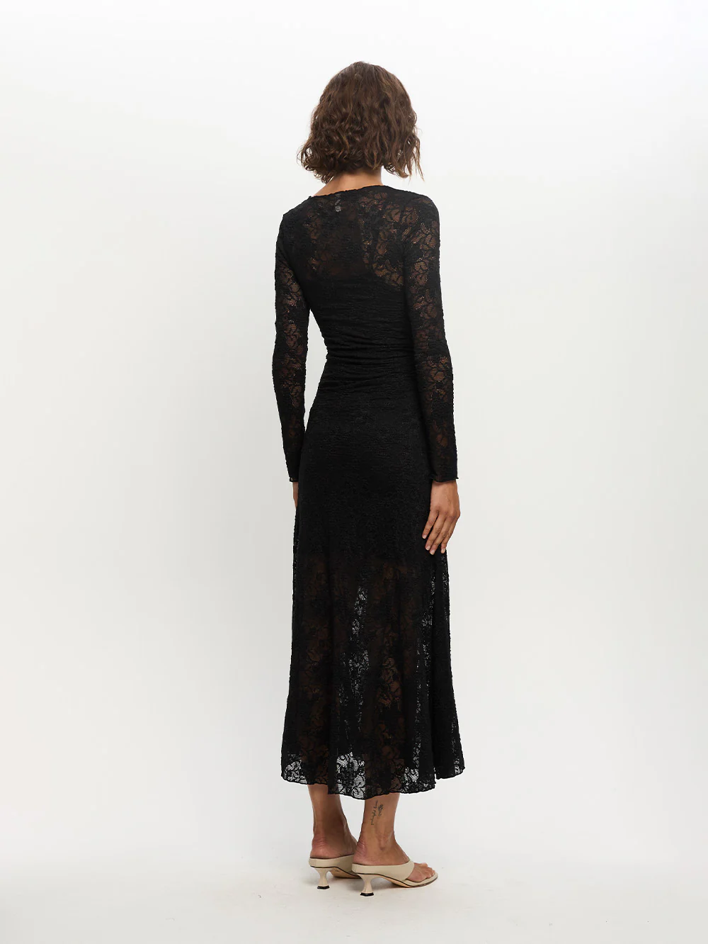 The Marie Lace Maxi Dress is a fitted dress crafted in sheer stretch lace featuring a high neckline, full length slim sleeves complete with a jersey slip mini dress. Please note this style runs small, if in-between sizes we recommend to size up.