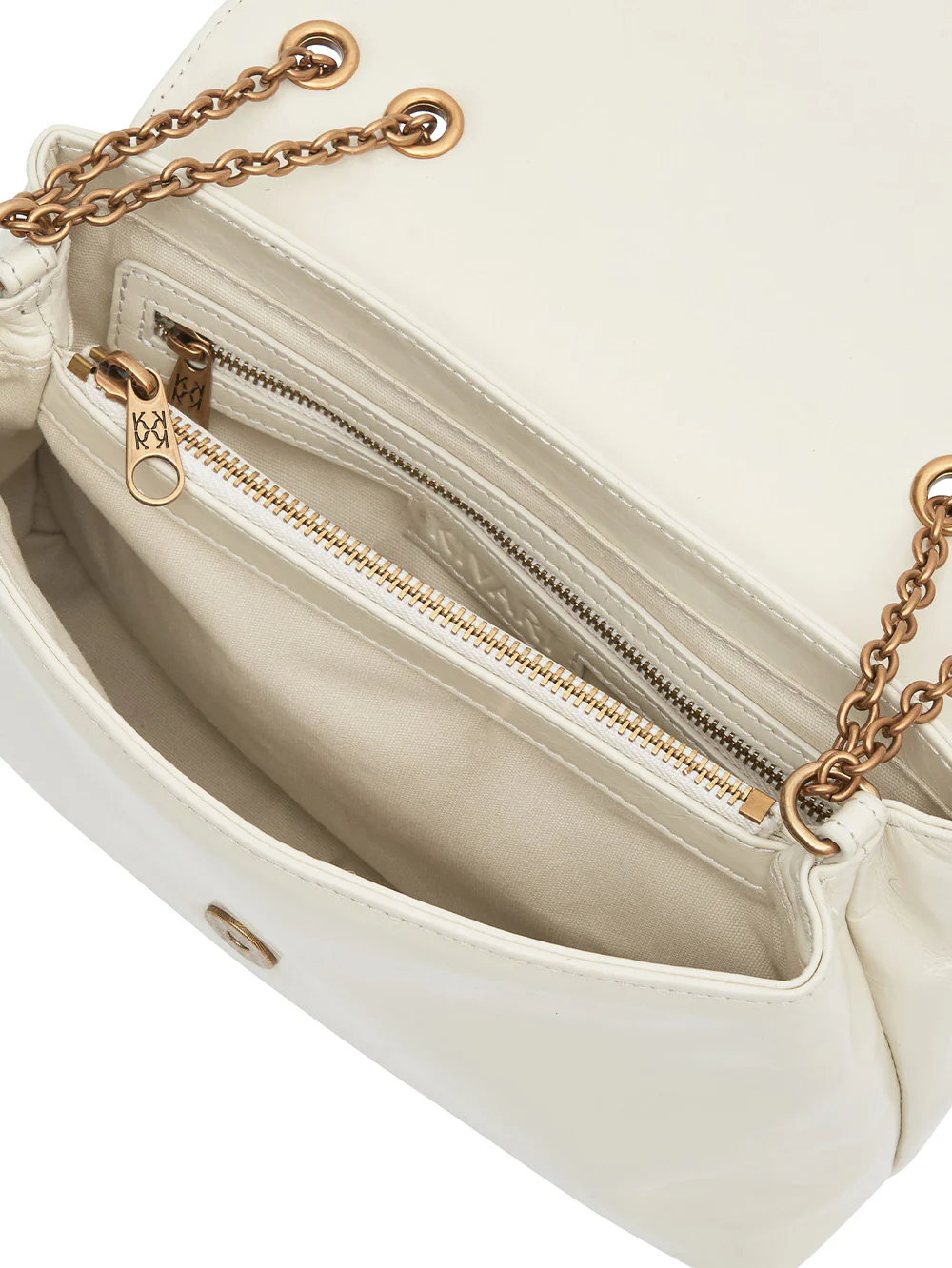 The Nia Shoulder Bag in a soft cream hue is crafted from 100% Waxed Leather and features two main compartments with a side zip pocket through the centre gusset. A fold over flap with magnetic clasp closure, complete with a gold-tone brass adjustable chain strap and hardware details.