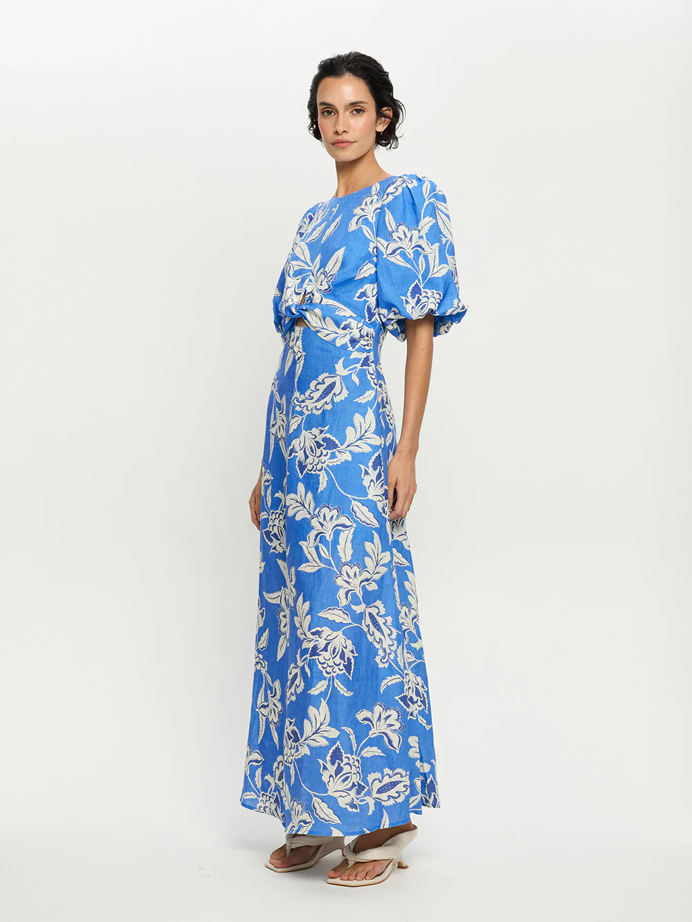 Ren is a vibrant blue print, adorned with crisp white floral motifs that feel both fresh and timeless. The Ren Maxi Dress is defined by its feminine round neckline and twist-front bodice, flowing into a silhouette framed by short bubble sleeves with soft elasticated cuffs. A statement style, designed to capture attention from sunlit days to evening occasions.