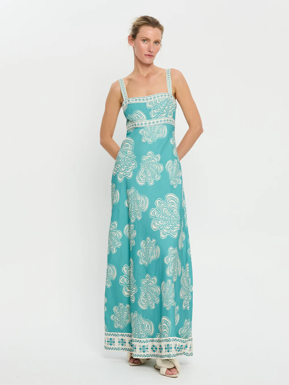 Skye is hand painted motif shells on a vibrant aqua blue base. The Skye Maxi Dress features a straight neckline, adjustable shoulder straps and subtle flared hem complete with a contrast print border throughout.