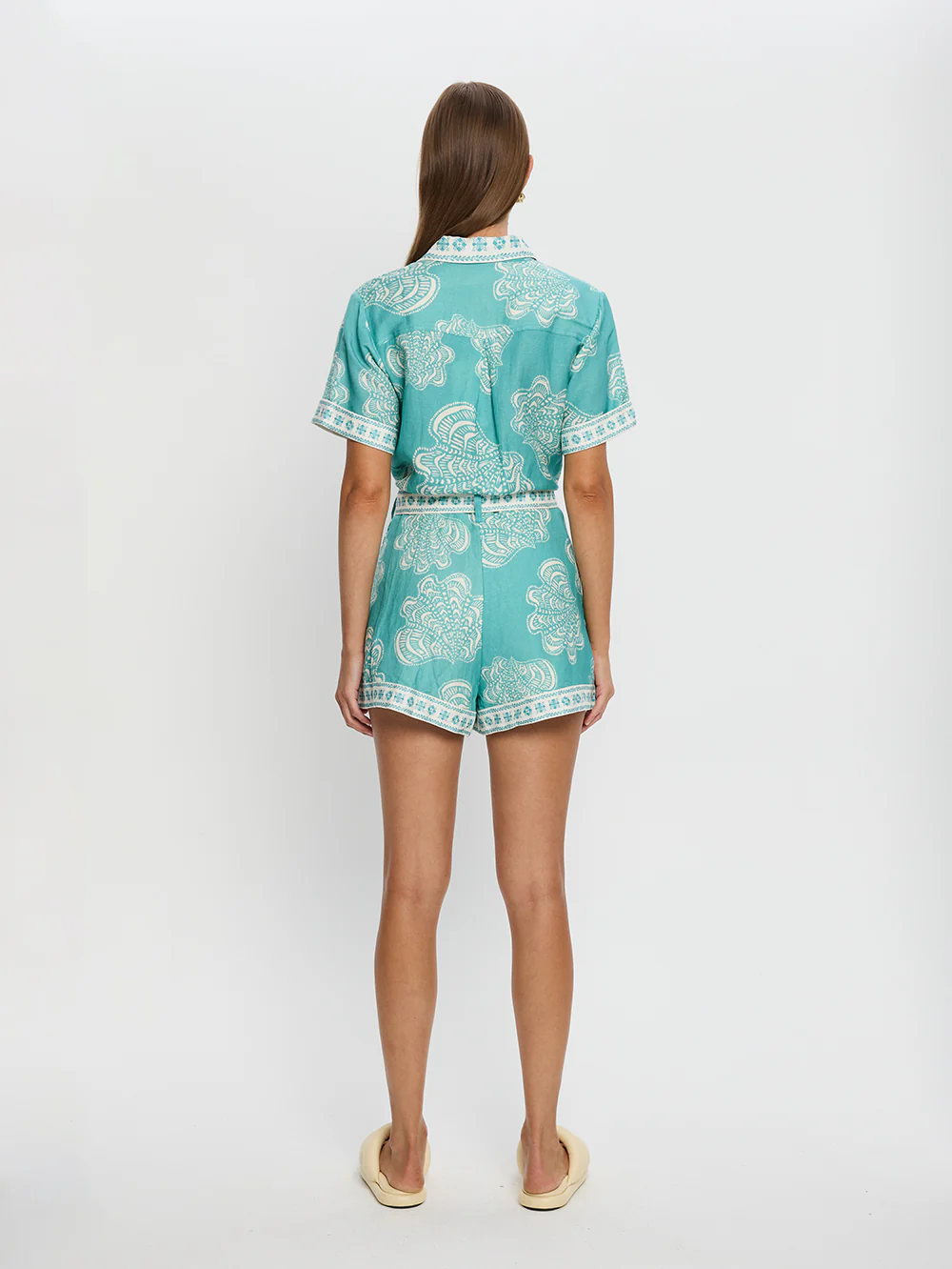 Skye is hand painted motif shells on a vibrant aqua blue base. The Skye Playsuit features a button through front, side seam pockets, contrast print throughout complete with an adjustable waist tie.