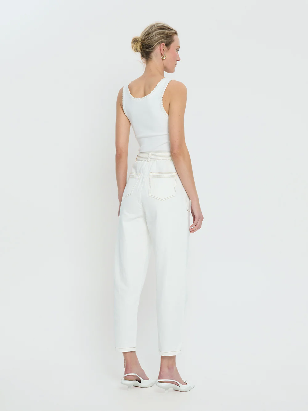 The Stevie Denim Jean in cream is crafted from 100% cotton drill and is a relaxed crotch and tapered leg style, featuring top-stitch detailing, front and back pockets, complete with a signature gold D-Ring belt.