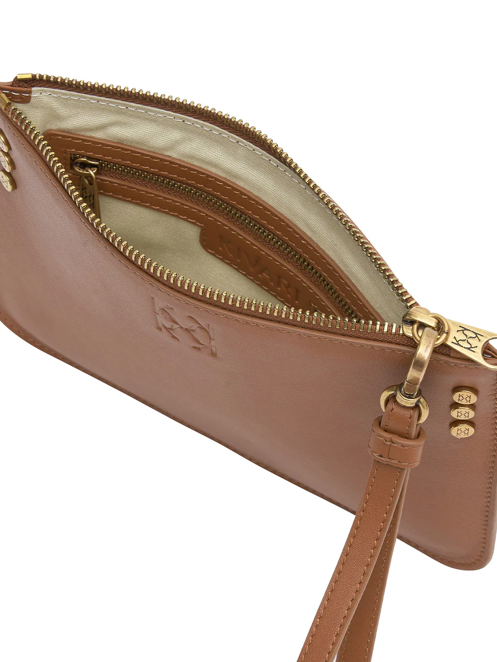 The Tallie Clutch is crafted from 100% Leather and features one main compartment with an internal zip pocket, removable wrist strap, outer side pocket, zip closure complete with embossed logo and gold brass hardware.