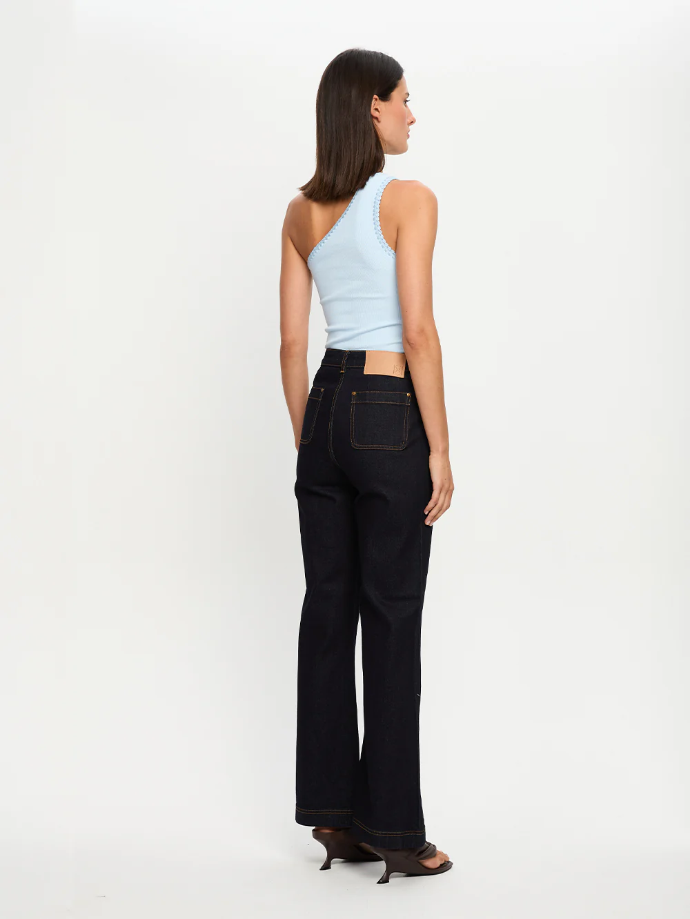 A modern essential, our signature Tallulah One Shoulder Tank in blue is cut from a premium rib knit. Defined by its asymmetric one-shoulder neckline and hand-crochet trim, this piece balances effortless wear with artisanal detail.