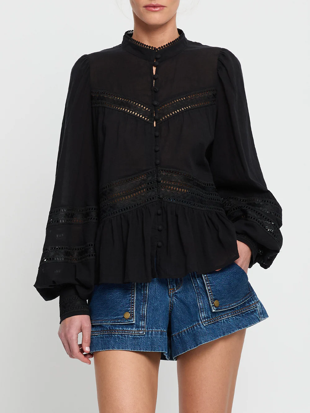 The Tana Blouse in black features a stand collar with lace edging, a button through front, complete with lace cutouts throughout.