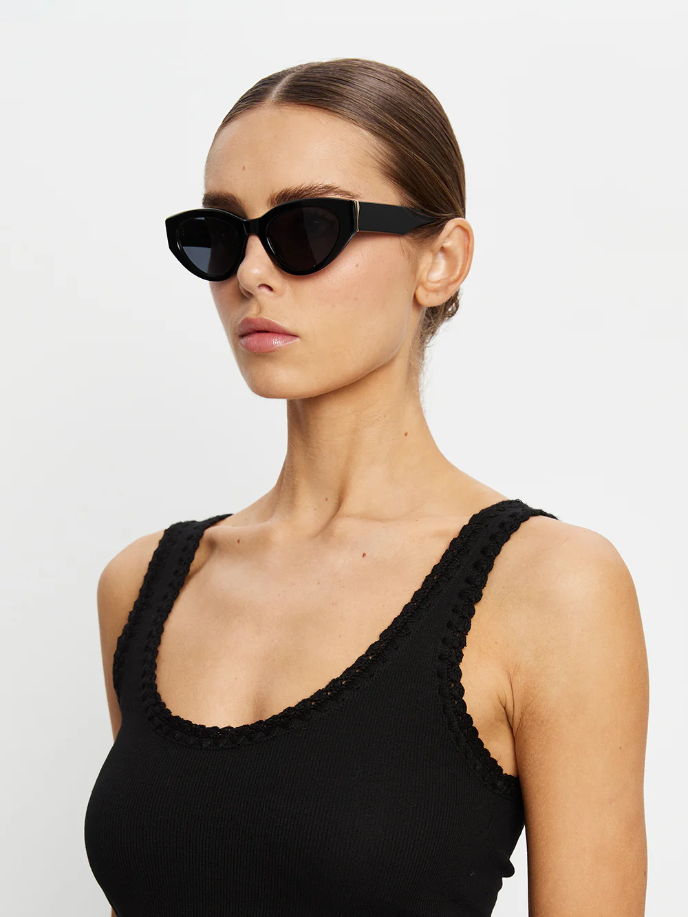 The Poppy in black is a chic cat eye style, which is a signature staple for all. Designed to be universal and timeless this style features an organic gold plate hardware on the temple elevating this classic. Finished in a premium black frame with smoke mono polarised lenses.